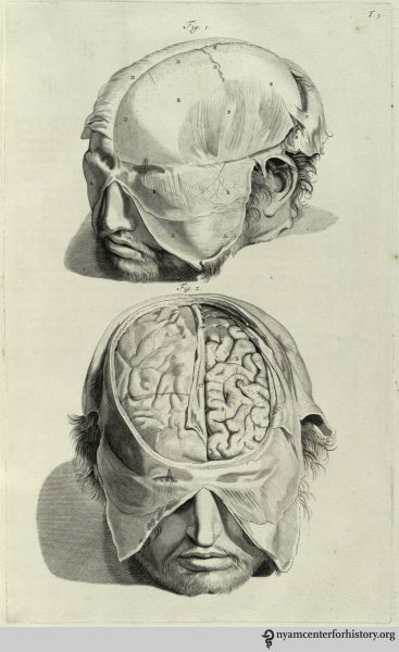 Bidloo’s Anatomia humani corporis includes 105 anatomical copperplate engravings, recognized as some of the finest illustrations of the Baroque period. Most anatomical books published in the late 16th and 17th centuries emulated the Vesalian style, with animated figures set in picturesque landscapes. Bidloo and Gerard de Lairesse, the artist, took this approach with their skeletal figures, such as this one contemplating an hourglass and the inevitability of time. The rest of the plates departed from this tradition, being realistic drawings of dissections. Table 5 shows the skull and scalp in the first figure and the dura mater and cerebrum in the second.