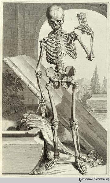 Bidloo’s Anatomia humani corporis includes 105 anatomical copperplate engravings, recognized as some of the finest illustrations of the Baroque period. Most anatomical books published in the late 16th and 17th centuries emulated the Vesalian style, with animated figures set in picturesque landscapes. Bidloo and Gerard de Lairesse, the artist, took this approach with their skeletal figures, such as this one contemplating an hourglass and the inevitability of time. The rest of the plates departed from this tradition, being realistic drawings of dissections.