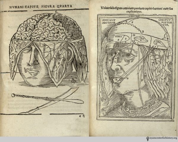 Images from great works in our collection, from Magnus Hundt’s 1501 Antropologium to Dominici Santorini’s 1775 Anatomici summi septemdecimtabulae, show the evolution of artistic style and scientific understanding. Some show examples of “borrowing” Vesalius’ images and placing them in new contexts.