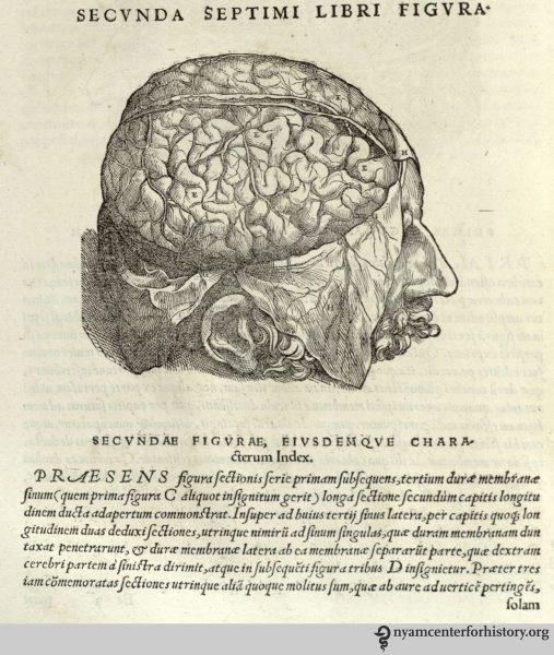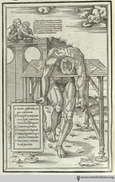 Dryander’s work contains a series of woodcuts depicting the dissection of the brain, starting with the removal of the upper skull and continuing through the hemispheres, cerebellum, and skull base. His book also contains a diagram of the brain’s ventricles. Illustrations like these had appeared since at least the 1300s, and Dryander’s artist took inspiration from Hundt’s Antropologium. Dryander’s illustrations—including his brain figures—in turn influenced anatomical texts to come, many of which (like the Fabrica) showed the anatomy in greater detail.