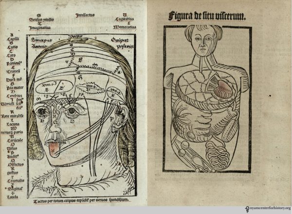 Magnus Hundt was a physician and theologian. His Antropologium, published in Leipzig in 1501, is a philosophical and religious work on the human body containing 17 anatomical woodcut illustrations. These are not the earliest anatomical illustrations, but they were the most detailed depiction of the organs created up to that point. The simple illustrations were intended as diagrams rather than realistic representations of the body and organs, and bones and muscles were not represented. The diagram of the head shows the three intellectual functions divided among three physical parts: common sense and imagination in the first, thought in the middle, and memory in the last.