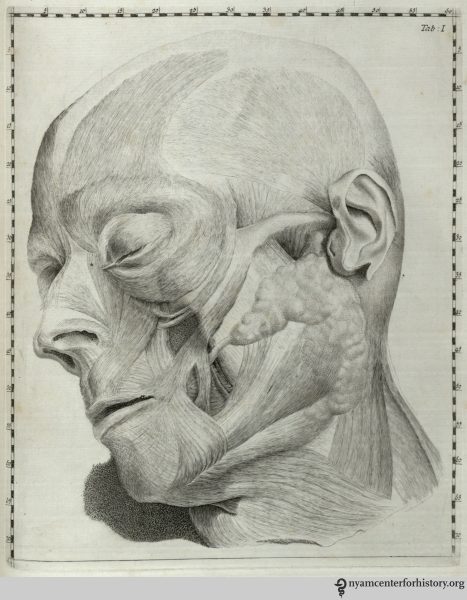 Santorini, a physician and professor of anatomy in Venice, made extensive discoveries during his lifetime, most notably identifying the accessory pancreatic duct. Santorini’s student, Michael Girardi, compiled Anatomici summi septemdecim tabulae and published it 38 years after his mentor’s death, including Santorini’s previously unpublished anatomical drawings and observations. The discoveries shared in this work include what is now called Santorini’s plexus, an important contribution to pelvic anatomy. He also described and illustrated facial structures, as seen here, including novel findings still useful to medical professionals. The book is considered one of the best anatomical works of the 18th century due to the high quality of its images and descriptions.
